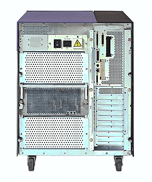 (1) Centronics compatible biderectional EPP port, DB25, 2 MB / sec (1) 10/100 Mb/sec autoselect ethernet port, RJ45 or MII. (1) keyboard/mouse, mini DIN-8 port. (1, 3, or 5) 40 MB/sec UltraSCSI-3 busses for internal disks. (1) 20 MB/sec fast/wide SCSI-2 bus for CD and tape, 68 pin external connector. |