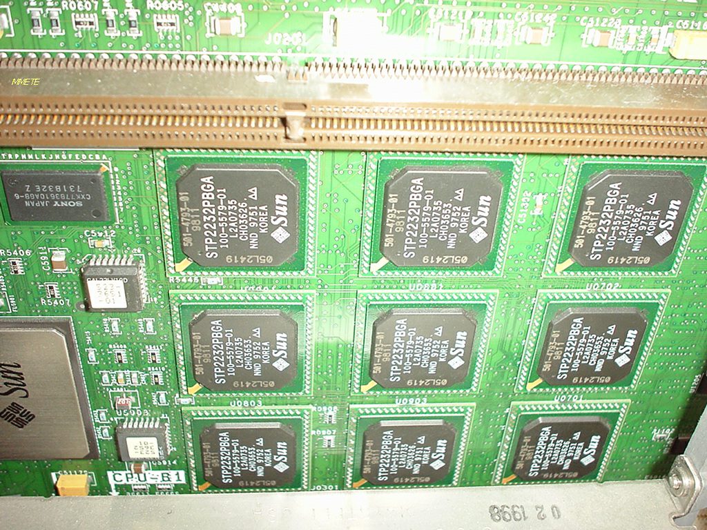 16 DIMM module slots. Install four at a time. Uses 32, 64 or 128 MB DIMMs (256 MB when available). 144 pin 5V 60 ns, 576 bits wide: 512 bits data, 64 bits ECC. Up to 1.78 GB/sec throughput. |